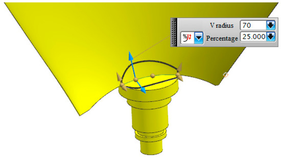 In order to study the improving effects of maximum dynamic stress in the thickened blade root, four impeller blade models with different blade root thicknesses, namely models 1 to 4, are established as demonstrated in Figure 10. Figure 11 displays the design method for the modification of the blade root thicknesses, where the edges blend for the blade root with a V-shaped radius of 70 mm. The maximum radius of the edge blend appears where the percentage of the leading edge to the outlet edge is 25% (the stress concentration region of blade). As shown in Figure 11, the thicknesses of the blade roots and the percentages from the leading edge to the outlet edge of the four models are 50 mm and 50%, 50 mm and 25%, 70 mm and 50%, and 70 mm and 25%, respectively. It is important to note that all connections between the edge blends and the blades and shafts are smooth.