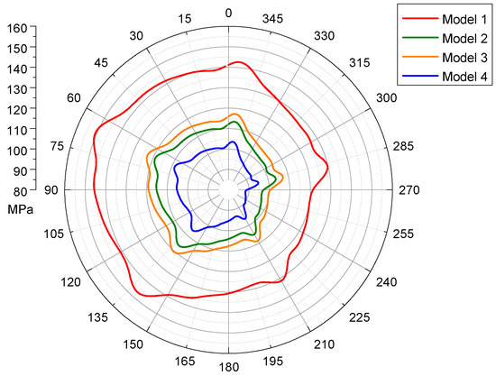 Through the FSI simulation of four blade models, the change rule of the maximum dynamic stress of four blade models over time within a cycle of spatial rotation in designed working conditions is figured out, as plotted in Figure 12. It is found that the maximum dynamic stress of the blade gradually reduces with the thickening of the blade root, and the maximum dynamic stress of Model 4 is only 108.41 MPa. Additionally, the local thickening effect on the stress-gathered area (Model 2) is slightly better than that for the whole root (Model 3).