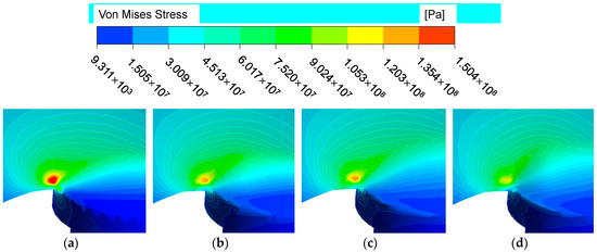 Maximum dynamic stress distribution of blades with different root thicknesses when φ = 66°: (a) Model 1, (b) Model 2, (c) Model 3, and (d) Model 4.