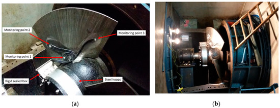 As shown in Figure 15, the stress test of blades on prototypical pump units is carried out, and three strain rosettes are installed on the surface of the blade. The strain rosettes and wires are fixed and waterproof-sealed by the coating method. The test instruments are placed in a rigid sealed box fixed by a bolt hole and a steel hoop on the impeller.