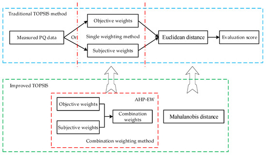 Therefore, this paper proposes an improved TOPSIS method for comprehensive evaluation of power quality considering the correlation of indices. The distance algorithm in the traditional TOPSIS method is improved, and Mahalanobis distance is adopted to replace Euclidean distance, which can avoid the juxtaposition of evaluation results and effectively overcome the misjudgment caused by the correlation between PQ indices. Due to the weighting being the precondition of PQ evaluation, this paper also proposes a new AHP-EW weighting method based on the combination of improved analytic hierarchy process (AHP) and entropy weight (EW) method to calculate the subjective and objective weights of indices. Compared with the traditional subjective and objective weighting methods, this method can consider the subjective and objective factors at the same time, and greatly reduce the amount of calculation, with strong operability. Finally, the statistical values of PQ monitoring data are evaluated by an example, and the results are compared with the traditional methods to verify the validity and correctness of the proposed algorithm.