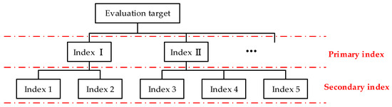 AHP is a multi-objective decision-making method founded by American operations researcher T. L. Satty. Its core idea is to rank the evaluation indices according to the experience of experts [27,28]. However, the traditional AHP usually constructs a judgment matrix and needs to pass the consistency test. In the actual calculation process, the test is often difficult to pass. As shown in Figure 4a, the portion of the red dashed box is uncontrollable. Therefore, the amount of calculation of the conventional AHP is large. Moreover, when the order of the judgment matrix is high, the amount of calculation will be larger. Therefore, experts [29] proposed using the scale method to construct the judgment matrix, as shown in Figure 4b. The improved AHP avoids the consistent test by constructing a judgment matrix, making the calculation process more straightforward and reducing the workload greatly.