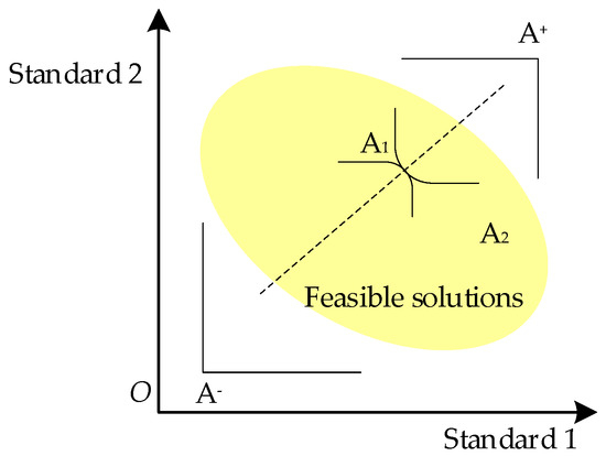 The positive ideal solution and the negative ideal solution are the ideal values of the hypothesis, that is, the positive ideal solution is the virtual best feasible solution, and the negative ideal solution is the virtual worst feasible solution. Figure 3 is a schematic diagram of the decision of the TOPSIS method for two objectives. In the figure, A+ and A− are positive ideal solutions and negative ideal solutions, respectively, which are virtual optimal solutions and worst solutions. Although A1 is closer to the positive ideal solution than A2, it is not far from the negative ideal solution. It can be seen that A2 is farther away from the negative ideal solution. Therefore, the advantage of TOPSIS method is that, among the solutions with the same distance from the positive ideal solution, the one with a longer distance from the negative ideal solution is selected as the satisfactory solution, which avoids the situation where a single ideal solution results in the same evaluation result.