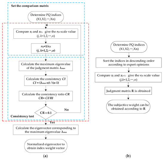 Equation (2) obtains the subjective weights of PQ indices, and Equation (8) obtains the objective weights of PQ indices. The subjective and objective weights of each index are multiplied and normalized, and the combined weight can be obtained as follows: