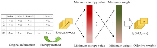 C. E. Shannon, the founder of information theory, introduced entropy theory into information theory as a measure of information disorder [30,31]. In this paper, the EW method is used to determine the objective weight of each index of PQ. As an objective method of weighting, the entropy method can obtain objective weights independently of subjective factors. The smaller the entropy value, the lower the information disorder, and the higher the available value, so the corresponding index weight should be larger. On the contrary, the larger the entropy value, the higher the information disorder, and the lower the available value, so the corresponding index weight should be smaller. The detailed relationship is shown in Table 2.