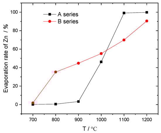 As can be seen from Table 3 and Figure 3, the evaporation rates of zinc in both series increased with a rise in temperature. When the reducing agent was carbon powder, the evaporation rate of zinc was 3.30% and 99.11% at 900 °C and 1100 °C, respectively. This suggests that the evaporation of zinc mainly occurs between 900–1100 °C, and the evaporation process can be divided into three stages. In this way, <900 °C is the dormant period, 900–1100 °C is the evaporation period, and >1100 °C is the final evaporation period. When ferrosilicon was used as the reducing agent, the evaporation of zinc increased gradually with an increase in temperature. The evaporation rate of zinc was 35.26% at 800 °C and only 90.47% at 1200 °C. Compared to the carbon powder, the temperature range of zinc evaporation is larger, and the evaporation rate is relatively smaller.