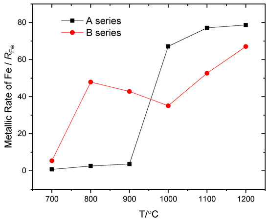 As shown in Figure 4, the metallization rate of the iron increased somewhat in the samples of series A and B with an increase in temperature. When the carbon powder was used as the reducing agent, the metallization rate of sample A3 was only 3.63%, while that of sample A5 was as high as 77.12%, which is slightly lower than that of sample A6 (78.67%). Hence, the metallization percentage of the iron-changing trend can be divided into three stages, similar to the evaporation process of zinc: <900 °C is the dormant period, 900–1100 °C is the metallization occurrence period, and >1100 °C is the final metallization period. Figure 4 demonstrates that metallization mainly occurs between 900 °C and 1100 °C.