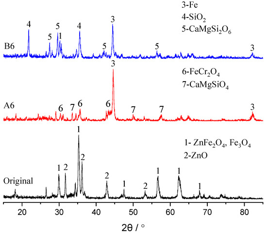 The microstructure and chemical components obtained by SEM-EDS are shown in Figure 5 and Table 4, individually. The mineral phases of samples A6 and B6 measured by XRD are shown in Figure 6. When the reducing agent was carbon powder, the EAFD samples maintained a relatively intact state for their particles, but the interface between the particles became vague at 1000 °C. According to the analysis of EDS and XRD, samples in A6 were clearly divided into two phases. Phase 1 is composed of Fe and Cr metal phases, and Phase 2 comprises a CaMgSiO4 phase formed by CaO, MgO, and SiO2. The residual zinc in the solid samples is lower than the detection limit of SEM-EDS.