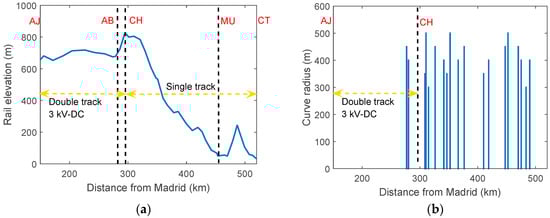 Route characteristics (main stations in red, electrified and non-electrified sections, double- and single-track sections in orange): (a) Alcazar SJ-Cartagena (sea level) track profile; (b) location of curves and their radius (m).