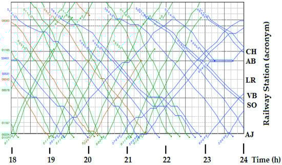 Additional information for simulation and evaluation purposes is the traffic in the route. This allows determining the existence of critical point for passenger and freight trains and the maximum and minimum number of trains in each substation and track. For the simulation, the traffic of this route is obtained for real traffic requirements and capacity of the single- and double-track sections (Figure 1). Some example of this information is given in Figure 3.