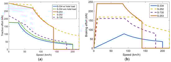 Effort characteristics of different vehicles (null values indicate that the unit cannot reach this speed, see Table 1): (a) Tractive effort; and (b) braking effort for locomotives, DMU and EMUs of different conception and service (manufactured from 1992 to 2012).