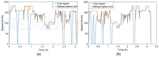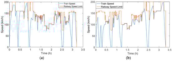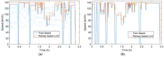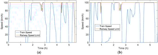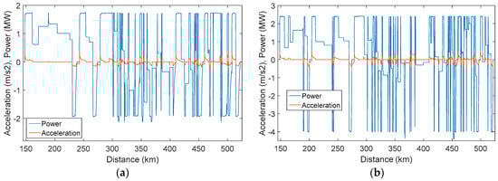 At the same time, there are also significant differences in the braking performance of the different locomotives. The maximum braking power for the two full-electrical locomotives is about 5.6 MW; however, the maximum braking effort is higher in S-253 (240 kN) than S-252 (168 kN), and the curve changes at low speeds. In the case of the hybrid locomotive/vehicle, the maximum braking power is limited to 4 MW. Finally, diesel-electric locomotive S-334 only can achieve a braking power around 1.9 MW (Figure 4b). For this reason, diesel and hybrid locomotives have fewer deceleration rates and more time is required to reduce velocity or completely stop a train if only the regenerative braking is applied by railroad engineers.