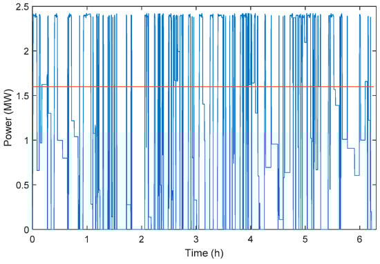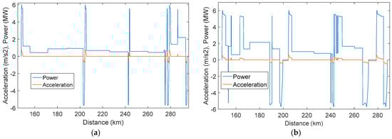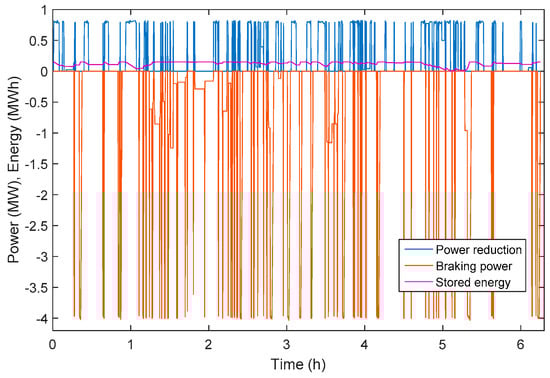 Regenerative braking is conceptually simple and is a well-known alternative to improve energy efficiency, but involves a very complex problem in practice, since there is not any certitude that two trains are at the same time and location (electrically speaking) with different roles in the Rail Power System (i.e., generator vs. load, a topic to be presented in Section 3.5). This problem is even more complex in conventional railways with low or medium traffic flow because the probability that several trains are in the same track of catenary is especially low. In this case, power cannot be injected in the network because it increases the voltage of the overhead line, or reverse flow is not possible, due to the configuration of substations [], generation is absorbed and dissipated through the resistive braking bank of locomotives. It is necessary to take into account that the possibilities of regenerative braking are raising due to two factors. First, storage seems now more feasible than a decade ago because of the decrease of capital costs, and the improvements in energy density, power density and lifetime of storage devices (partially driven by the deployment of Electric Vehicles and the Integration of Renewables, RES). Secondly, the capacity of regenerative braking can be increased through converters, so that it is not necessary to use the same rate of friction (pneumatic braking) in blending mode during service braking throughout the entire practical speed range. This is called pure electric braking []. As can be shown in different figures, this improves the performance of braking, but only if energy can be stored or utilized in some way.