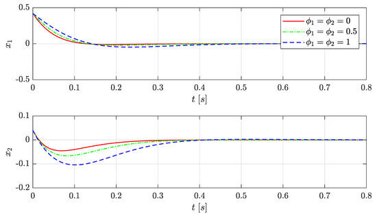 As shown in Figure 2, the closed-loop system stability is guaranteed for all the values of and that were mentioned. Moreover, note that the system’s response that was evaluated with the scheduling parameters , corresponds to the maximum allowed limit values of and , obtaining the fastest system response and showing that the designed LPV state-feedback controller is able to adjust the system’s performance depending on the different values taken by .