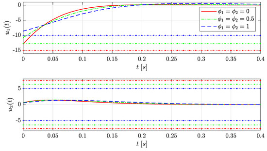 Figure 6 shows the evolution of the Lyapunov function , which decreases slower when the guaranteed decay rate , as a result of fixing and faster when . As a consequence, the closed-loop system performance is modified online according to changes in the saturation limits.