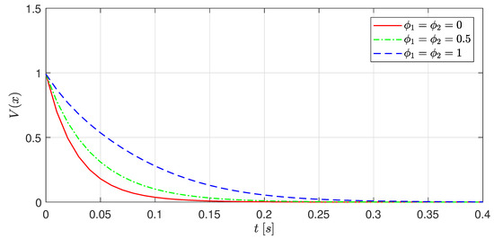 Figure 4 shows the evolution of the Lyapunov function for the three frozen values of and , which correspond to guaranteed decay rates of 10, 5.5 and 1 respectively. It can be seen that the largest decay rate corresponds to the fastest closed-loop system response, whose saturation scheduling parameters are and . Also, all the functions are under the unit value, hence it is guaranteed by design that none of the control inputs saturates, as already shown in Figure 3.