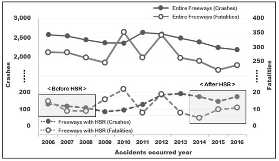 On the other hand, transportation engineers in South Korea are divided in terms of their support for this design. The biggest concern for some engineers is a potential decrease in road safety. The purpose of having a road shoulder is to serve as an emergency stopping lane for motorists and to allow for recovery of errant vehicles before a potential collision occurs [17]. Its omission may therefore result in more frequent vehicle crashes [18,19,20]. The Korea Expressway Corporation (KEC), the central authority for operating the freeway system, acknowledges that vehicle crashes in freeway sections with HSR have increased [21]. As shown in the lower half of Figure 1, there were a total of 350 vehicle crashes in the three years before the introduction of HSR in the seven freeway corridors, but the number of vehicle crashes increased to 493 in the three years after the introduction of HSR in the same freeway corridors [21]. On the other hand, as shown in the top half of the figure, the number of crashes for the entire freeway (with and without HSR) has fallen for the corresponding before and after periods.