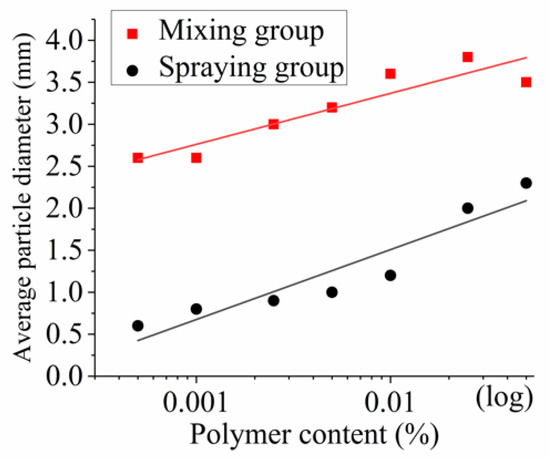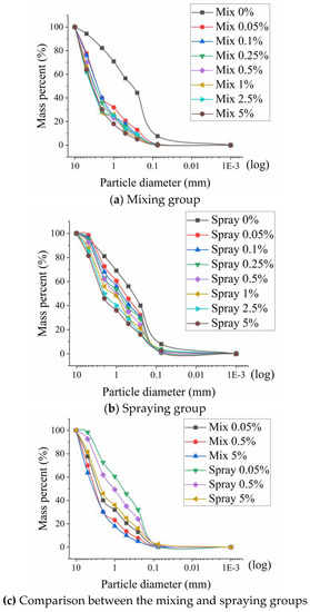 In the two application processes, the slope of the grading curve of the particles increased successively with increasing ADNB content, as shown in Figure 3a,b. This indicated that the proportion of large-diameter particles in the sample was increasing. In general, as shown in Figure 3c, the curves of both the mixing and spraying groups increased with increasing ADNB content. Moreover, the slope of the mixing group was higher than that of the spraying group. From these results, it can be seen that the soil particles were effectively bonded in both processes. The mixing process had a stronger cohesion effect.