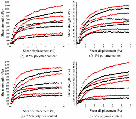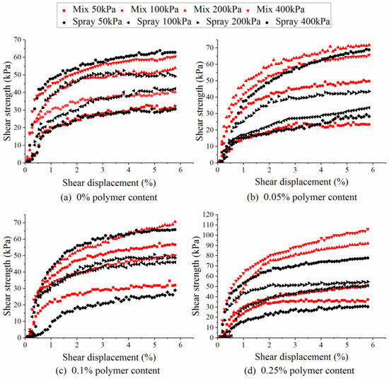 The shear stress–shear displacement curves of the two groups of soil samples with a polymer content of 0% were basically identical, as shown in Figure 5a. This indicated that their shear strength was basically the same. Therefore, the sample preparation method had little influence on the soil shear strength. However, as shown in Figure 5b–h, the shear strength of the samples increased with increasing ADNB content in the two application processes. This indicated that the shear strength of the soil was improved after the treatment. It also indicated that the shear strength of the soil samples could be improved by the two application processes. However, for the same content and vertical pressure, the shear stress–shear displacement curves of the mixing group were always above those of the spraying group; that is, the improvement effect of the mixing process was better than that of the spraying process.