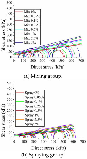 In terms of the cohesive force, the c value of the 0% mixing group was only 19.0 kPa, and the c value of the 5% mixing group was 38.2 kPa. It was 101% higher than that of the 0% mixing group. The c value of the 0% spraying group was only 19.1 kPa, but that of the 5% spraying group was 32.6 kPa. It was 71% higher than that of the 0% spaying group. With regards to the internal friction angle, that of the 5% mixing group increased the most (i.e., an increase of 79% compared to the 0% mixing group). The increase in the internal friction angle of the spraying group was small. The 5% ADNB content resulted in the largest increase—only 21% higher than that of the 0% group.