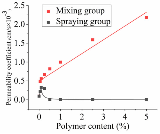 In regard to the permeability, the permeability coefficient of the 5% mixing group increased by 2147% compared with the 0% mixing group. This was the largest increase. The permeability coefficient of the spraying group first increased and then decreased. When the content was 0.1%, the permeability coefficient reached a peak. Compared with the 0% spraying group, the increase was 243%. After the content became higher than 0.1%, the permeability coefficient presented a downward trend and then tended to be stable. When the content was 5%, the permeability coefficient was the lowest. Its value was 97% lower than that of the 0% spraying group.