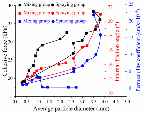 The above tests indicated that ADNB improved the slip resistance of the soil. Figure 11 shows the relationship between the parameters that represent the soil slip resistance. In short, the cohesive force, internal friction angle, and permeability coefficient of the soil all increased with increasing average particle diameter. The reasons were analyzed as presented in the following.
