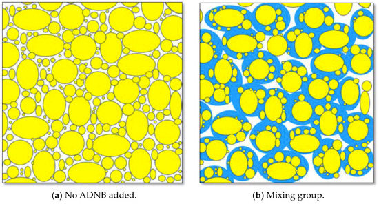 The small particles in the mixing group adhered to the surface of the large particles because of the ADNB. This resulted in large aggregate structures of the soil. When the soil samples were compacted and formed as shown in the schematic diagram in Figure 12b, the large aggregates overlapped and cemented each other. The voids between the aggregates were less filled by small particles. As a result, the porosity and permeability of the soil samples increased. The increased of porosity and permeability was beneficial to the growth of plant root. It was good for plants to absorb water and nutrients, thus, promoting the growth of plants. At the same time, ADNB permeated and diffused into the soil samples, which enhanced the integrity of the soil sample. Moreover, during the direct shear tests, the test instrument not only had to overcome the friction between the aggregates, but also needed to destroy the bonds between the aggregates. This was reflected by the macroscopic improvement of the cohesive force. After the soil particles were consolidated, the particle distribution and particle shape of the soil were changed. Therefore, the internal friction angle of the soil mass increased. Then, the increased permeability coefficient, cohesive force, and internal friction angle improved the slip resistance of soil.