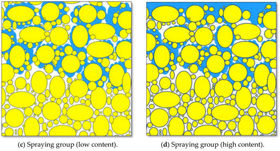 In the particle analysis results, the particle grading curves of the 0% samples in both the mixing and spraying groups were relatively gentle. This indicated that particles of each diameter were distributed in the soil. As shown in the schematic diagram in Figure 12a, small particles were packed tightly into the voids surrounding the large particles. Thus, a dense soil structure was formed. Therefore, the porosity of the 0% samples was low, and they had lower permeability coefficients.