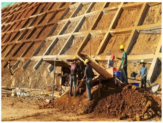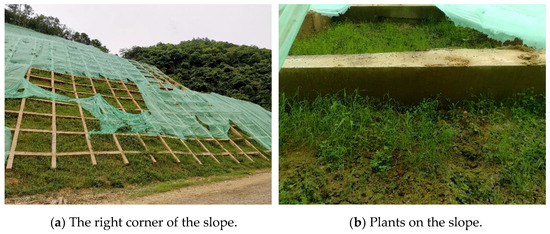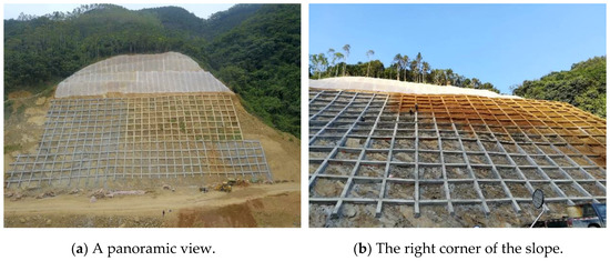 The constructed slope was located in Southern China, which has a subtropical monsoon climate. In summer, it is hot and there is abundant rainfall with typhoon and rainstorm activities. The annual average temperature is 22.3 °C. The annual average rainfall is 2392.3 mm. The constructed slope had a dip angle of 40–50°. The lithology of the slope was mainly mudstone with strong–medium weathering and some sandstone. The slope was mainly reinforced by lattice beams and anchor rods (or cables) (Figure 14a,b). This area has slopes that have been ecologically restored. However, because of the heavy rainfall, serious soil erosion occurred. After repeated maintenance, the ecological restoration effect deteriorated. Therefore, it was necessary to improve the slip resistance of borrowed soil.