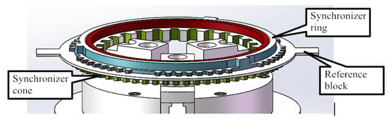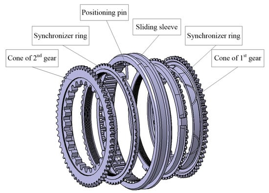The common structures of synchronizers include the inertia type, supercharged type, etc., but the working principle is basically the same. They all rely on the friction principle to synchronize the synchronizer ring and cone, where the rotational speeds are different, to achieve smooth shifting [8]. Taking the inertia type synchronizer as an example, its structural composition is shown in Figure 1. The main components are the sliding sleeve, synchronizer rings [9], cones, and the positioning pin.