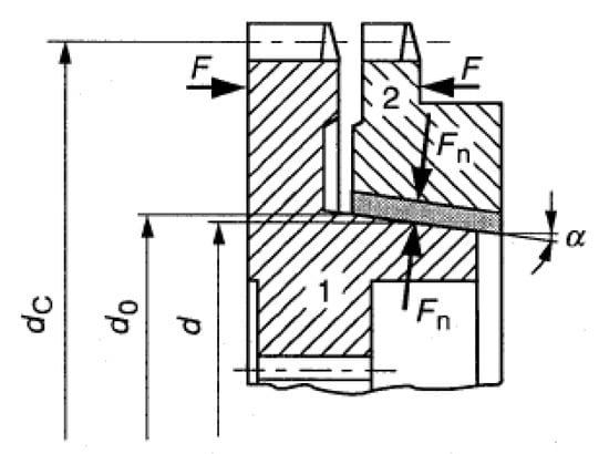 Friction is critical in the use of the synchronizer. As shown in Figure 3, friction between the synchronizing ring and the cone is determined by positive pressure F, friction angle α, and friction coefficient μ [11]. If positive pressure F is determined, when the synchronizing ring is deformed friction angle α and friction coefficient μ will change which will result in a change of friction.