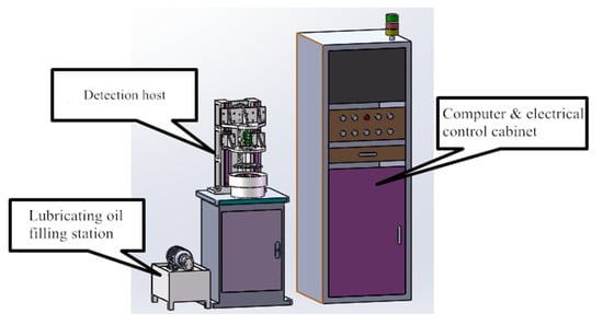 Detection system of matching quality between synchronizer ring and cone is mainly composed of detection host, computer and electrical control cabinet, and lubricating oil filling station. Its schematic diagram is shown in Figure 9. The technical parameters are as follows: the range of synchronous ring end force is 0–2000 N (adjustable), 0–500 N, with an accuracy of ±1%; the rotation speed of synchronizer cone is 0–50 r/min (adjustable), with a measurement accuracy of ±1 r/min; the measurement range of synchronizer cone drive torque is ≤ 20 N m, with an accuracy of ±0.1%.