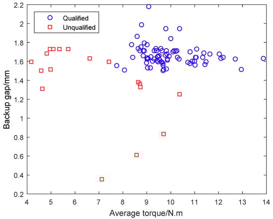 On the basis of a large amount of samples, the RSS variance analysis method of interval estimation is used to determine the qualified range of the main index, average torque, which is 7.50–13.00 N·m, and the optimum value is about 10.00 N·m. The qualified range of the backup gap is the specified 1.50–1.75 mm. A distribution map of sample points can be obtained by taking two indicators, as the coordinate axes show in Figure 14.