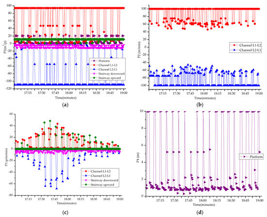 - Uncertainty: As at least two indicators were used for each facility, the congestion assessment results were different when applying the criterion in Table 1. Taking the crowding assessment in the channel as an example, the LOS was C when using P1 = 2.29 m2/ped. When using P2 = 63.50 m/min, the LOS was E. When using P3 = 25.63 ped/(min·m), the LOS was B. Thus, uncertainty was seen in the assessment as a same indictor resulting in different LOS results.