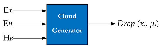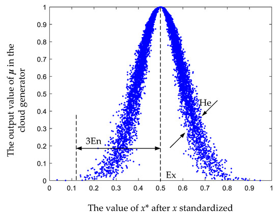 - Cloud model: Let be a quantitative domain and let be a qualitative concept on . If a certain value , then x is a random implementation of . The determinacy of x to is a random number with a stable tendency : →[0, 1], ∀ , x→. Then, the distribution of x on the domain is called a cloud, and each x is described as a cloud droplet. Three parameters, the expectation Ex, the entropy En, and the super-entropy He, are used to characterize the normal-cloud model, as shown in Figure 5.