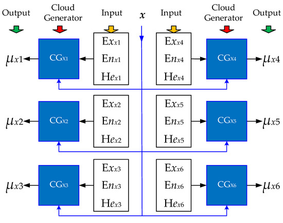 - Output of the cloud generator, (j = 1, 2, …, n), represents the degree of x belonging to Xj. The fuzziness and randomness nature of the NC model indicates that, instead of a determined number, is a random number with a stable tendency. After normalizing all , Equation (8) shows the weights for each :Using the digital features of the child clouds calculated from Equation (3), cloud Xx (ExX, EnX, HeX) is obtained where x is the input.