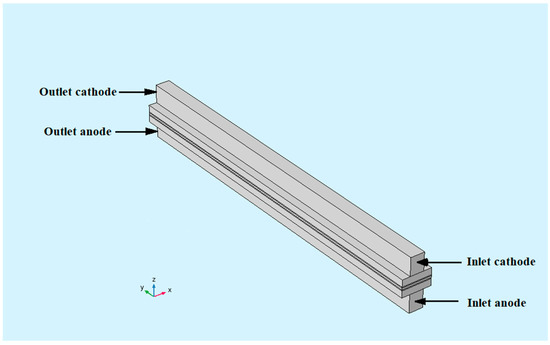 In this study, a single-channel HT-PEMFC with a PBI membrane is modeled in three dimensions and isothermal. The schematic of the computational region, including the PBI membrane, the catalyst layers, the gas diffusion layers (GDL) and the gas flow channel, is shown in Figure 1. In this figure, the upper part of the geometry is the cathode and the lower part is the anode.