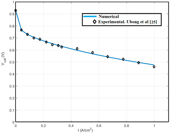 As shown in Table 2, the results are close to each other for the 1,288,763 and 31,624,896 meshes, and finally, to reduce the computational time, the mesh number has been selected 1,288,763. It is important to note that in order to get the best response, it is crucial to consider the number of meshes suitable for the GDL, the catalyst layer, and the membrane along Y. To increase the accuracy of simulation, given that the reaction occurs in the catalyst layers, the mesh of this section is finer, and a multi-grid method is used for meshing (Figure 2). The number of meshes in percent used for gas channels, GDL, catalyst layer, and the membrane are 15, 35, 45, and 5, respectively. For validation, a numerical study has been used from the experimental work of Ubong et al. [27], which is shown in Figure 3. As can be seen, there is an acceptable agreement between empirical work and numerical simulation.