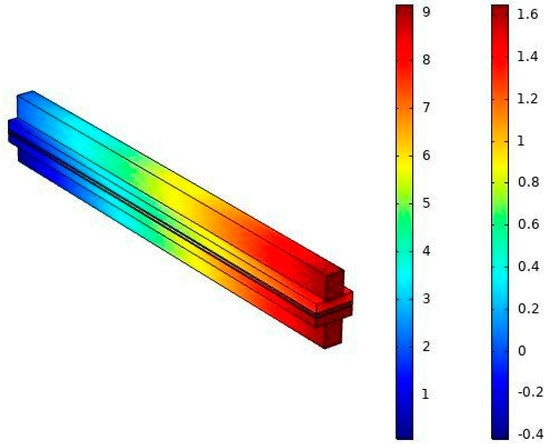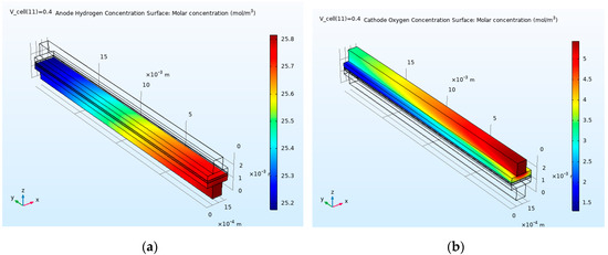 The concentration of reactive species, namely, hydrogen (Figure 6a) and oxygen (Figure 6b), are shown in Figure 6 at 180 °C and at a voltage of 0.4 V. As can be seen, the highest concentration is at the channel entrance, and the concentration of species decreases towards the channel outlet, as the species entering the anode and cathode channel, the reaction is started and species are consumed to generate current density According to figure, the oxygen concentration along the cathode channel reached from 1.26 to 5.43 mol/m3 and the hydrogen concentration along the anode channel reached from 25.8 to 25.2 mol/m3 that indicating a higher concentration of oxygen comparing to hydrogen.
