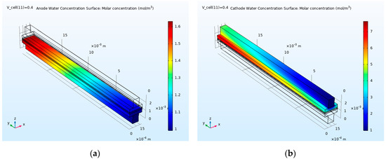 In Figure 7, the distribution of water concentration in the anode (Figure 7a) and cathode (Figure 7b) is shown at 180 °C and at a voltage of 0.4 V. Regarding the figure, it can be seen that the behavior of water dispersion in the cathode and anode channels is different from the dispersion behavior of the species concentration according to Figure 6. In contrast to species concentration, the lowest concentration of water is observed at the entrance of the channels, and the highest concentration of water is observed in the channel outputs. Because with moving of reactants from the entrance to the outlet, the species is consumed and more water will be generated by the reactions. Water management in fuel cell is critical, so that a substantial decrease in humidity content of the inlet gas causes the membrane to dry and its ionic conduction decreases and, as a result, decreases its performance; in contrast with an excessive increase of the water level in the fuel cell, water droplets create a critical condition that blocks the pores of the porous layers and subsequently prevents the transfer of reactive gases.