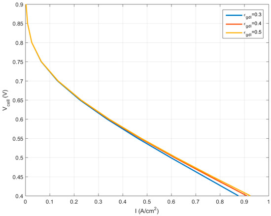 The effect of porosity coefficient of the GDL at 180 °C is shown in Figure 8. This graph is depicted for three porosity coefficients of 0.3, 0.4, and 0.5. According to this figure, the porosity coefficient has its most impact on the performance of the fuel cell at low voltages, which, with its increase, the fuel cell generated power will be enhanced. But at high voltages, there is no noticeable change, as the species consumption rate is lower at high voltages.
