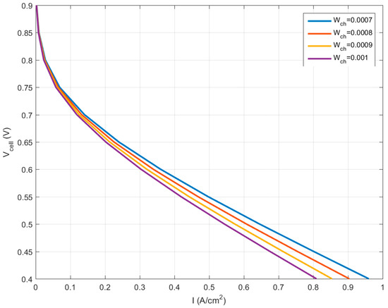 In Figure 10, the effect of channel width increment on fuel cell performance is shown. Based on this figure, with increasing channel width, the fuel cell generated power is reduced; as the channel width increases, the inlet velocity of the species decreases, and as a result, the diffusion rate of species will also decrease. The result will be a lower current density generation in the fuel cell.