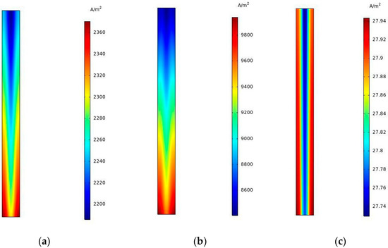Figure 11 shows the dispersion of the current density generated by the fuel cell at 180 °C and 0.3, 0.6, and 0.9 V at the membrane surface. As can be seen, at low voltages of 0.3 and 0.6 V, due to the higher input inflow of the species, they penetrate into the reaction spot more and also more species participate in the reaction so that according to the figure, the difference in the amount of current density produced at high and low voltages is quite evident. Therefore, at the channel inlet, the produced current density is lower and this value increases towards the channel output as more and more reactants are consumed (Figure 11a,b). On the contrary, as the voltage increased to 0.9 V, the produced current density decreased, because at higher voltages, due to the lower input flow rate, the species flowed with less velocity and penetration and almost uniformly along the channel and followed by less reaction, the current density is reduced and the distribution of the current density is almost uniform from the inlet to the outlet (Figure 11c).