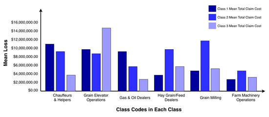 Based on the data in Table 7, the financial risk calculation is done for the expected losses of the workers’ compensation claims in the classes selected based on the LCA model in the previous section. The financial risk definition used here is the multiplication of the frequency of losses (number of incidents in each class) by the severity of losses (the mean of the total cost of claims incurred per class code in each class). Figure 1 shows the results of the financial risk calculation. This provides a simple frame for estimating future losses based on the historical data and the latent class analysis. As Figure 1 shows, the biggest claim costs were from chauffeurs or helpers, grain milling, and grain elevator operations in latent classes one, two, and three respectively, between 2008–2016. The occupational injuries (or fatalities) among grain elevator operations in class three and the grain-milling class codes have the highest mean total claim cost compared to classes one and two.