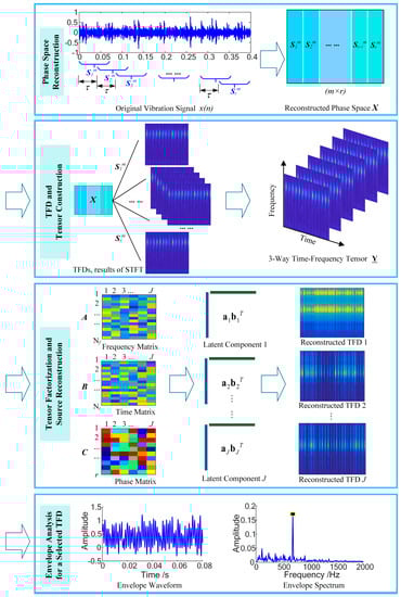 With respect to two-dimensional methods like time-frequency analysis, the time-frequency distribution (TFD) obtained by short time Fourier transform (STFT) [], Wigner distribution, wavelet transform [], etc., provides an effective tool for analyzing non-stationary vibration signals, as it incorporates information from both the time-domain and frequency-domain. Also, it is interesting to note that relevant studies based on matrix analysis emerged. Given the non-negativity of TFD, Lin et al. combined the time-frequency analysis with non-negative matrix factorization for feature extraction in []. Leng et al. utilized singular value decomposition (SVD) to identify relevant information from background noise, which was combined with envelope analysis to detect a fault feature of rolling bearings in []. Jiang et al. introduced the ratios of neighboring singular values to distinguish different beating fault types []. Specifically, SVD resorts to the Hankel matrix to obtain a two-dimensional representation for a time series, which signals the trend of the high-dimension analysis. The study of Qingbo and Xiaoxi reports a combination of time-frequency analysis and manifold learning for signature enhancement [], in which phase space reconstruction (PSR) is used for constructing a three-dimensional TFD manifold. It provides finesse for enhancing the impulse feature, but inconvenience appears, as the TFDs must be changed into vectors for manifold learning. The techniques mentioned are admittedly efficacious for feature extraction in two-dimensional representations; however, the applications are limited when confronted with higher-order data.