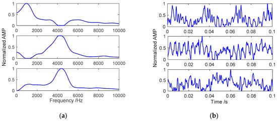 Then, we set the reduced-dimension index at 3, knowing that the two high-frequency resonance bands in the spectrum (see Figure 5b) could be separated from the low-frequency component using SNTF. We let the sparseness regulation parameter be 0.20, and performed the SNTF-HALS method to factorize the tensor into three sparse nonnegative matrices: , , and . and respectively, indicate the data distributions in frequency domain and time domain, as presented in Figure 6, where we separately plotted them as curves.