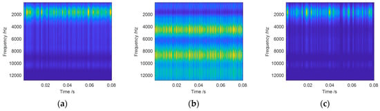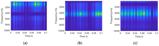 Based on the HALS-SNTF algorithm, as major peaks in the frequency spectrum are found at 1695 Hz, 4616 Hz, and 8094 Hz, the reduced-dimension index is set to three, and the data tensor is decomposed further into factor matrices, within which we are interested in the frequency matrix and the time matrix . By the vector product , three reconstructed TFDs are obtained, respectively, corresponding to three different feature subspaces, as provided in Figure 23a–c.