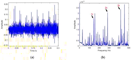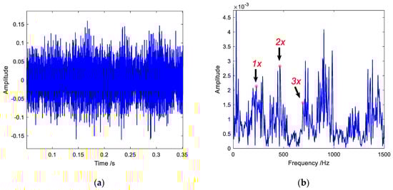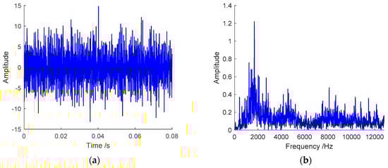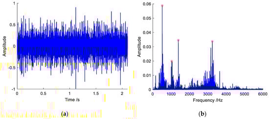 The original vibration signal: (a) The waveform incorporates a few impulses; (b) in the spectrum, prominent resonance bands stand out at around 500 Hz, 1000 Hz, 1300 Hz, and 3250 Hz.