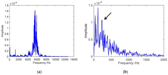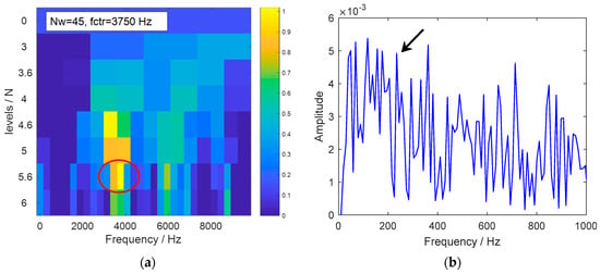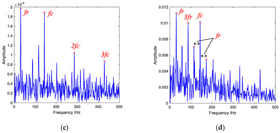 More components can be found in Figure 16d; e.g., the running speed and its harmonics. Additionally, the modulation on the fault frequency is obvious. We attribute the phenomena to the relatively lower interval of frequency band. Even so, the fault-induced impulse feature is successfully extracted.