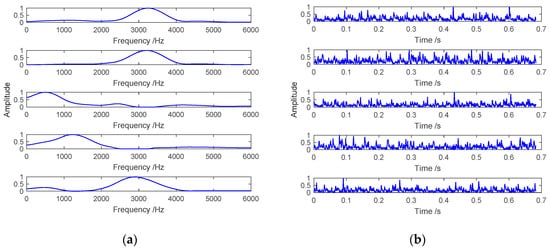 Next, we applied HALS-SNTF to decompose the tensor. As the index determines the low rank of the decomposed factors, knowing that the frequency spectrum (see Figure 13b) incorporates four distinct resonance peaks, it is reasonable to assume the four peaks could be separated from the low-frequency component by SNTF and to assign five to . The sparseness regulation parameter remains at 0.20. Then, the tensor, , was decomposed using HALS-SNTF into three factors. We visualized the frequency matrix and time matrix in Figure 14.